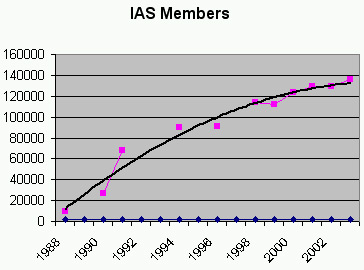 Our graph indicates 80,000 cumulative members for 1994, so 58% of lifetime members had been removed from the mailing list in the first ten years. If this applies today then there should be around 60,000 actual Lifetime members, and the total active IAS membership should be around 150,000.